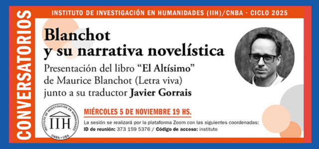 Invitamos a la comunidad a participar del próximo conversatorio del Instituto de Investigación en Humanidades (IIH), Blanchot y su narrativa novelística: Presentación del libro "El Altísimo" de Maurice Blanchot (Letra Viva) junto a su traductor Javier Gorrais, el próximo miércoles 5 de noviembre a las 19:00.
